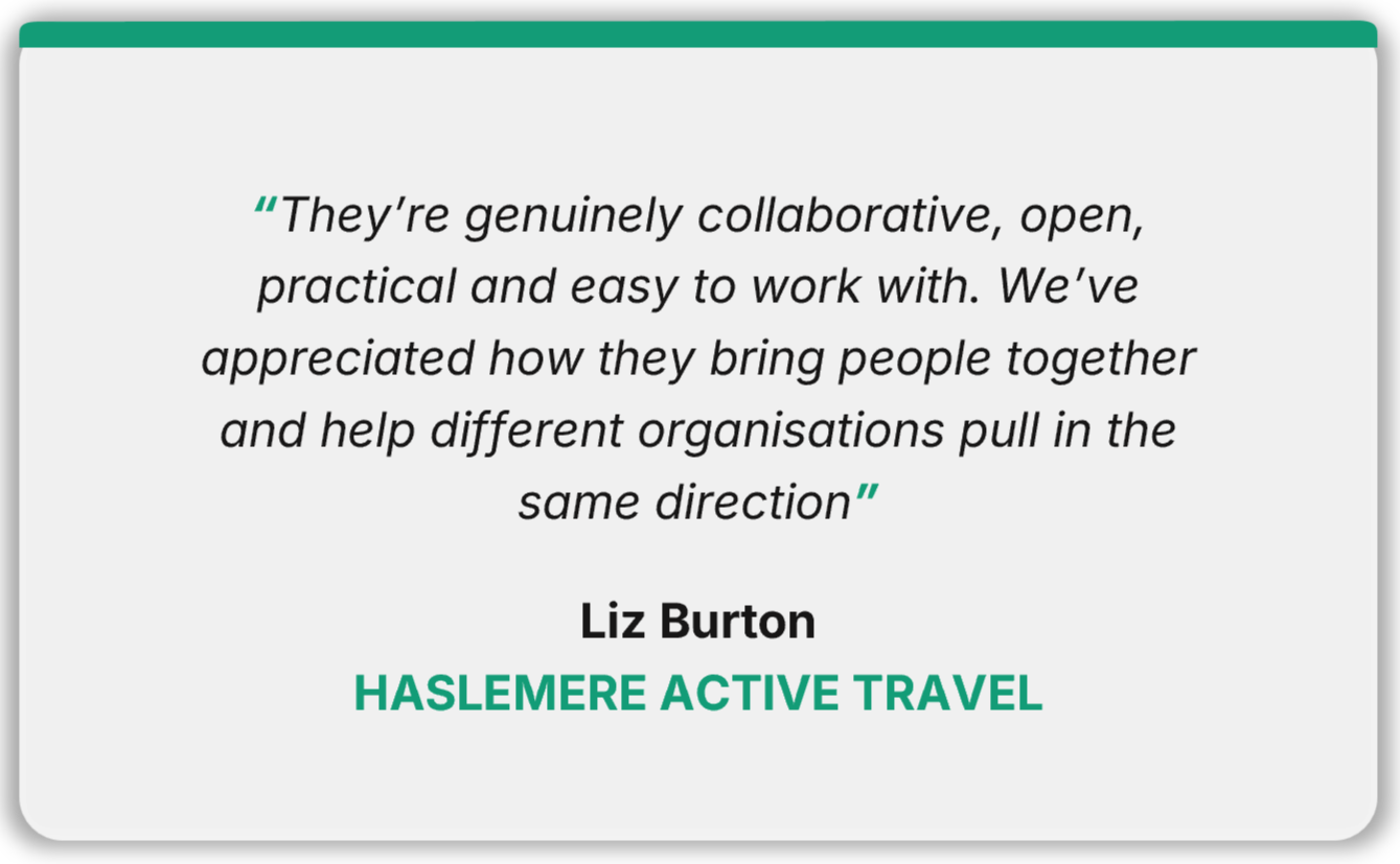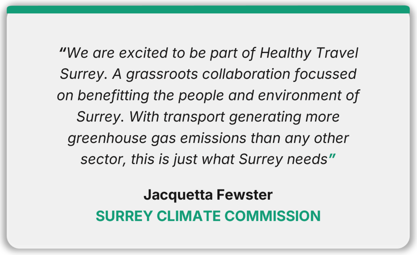 Healthy Travel Surrey is a coalition of community groups from across the county. It exists to help Surrey’s decision‑makers and community organisations take practical, evidence‑led action that improves everyday travel, strengthens local economies and supports healthy, thriving places.