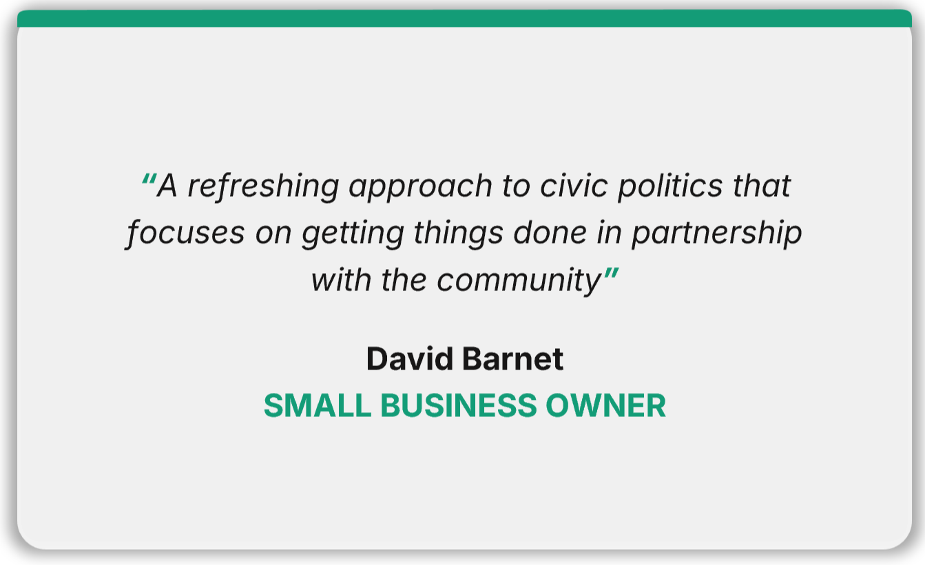 We work closely with people and organisations across Surrey, from residents and community groups to elected representatives, local businesses, organisations supporting marginalised communities, and educational or faith‑based partners. The endorsements below reflect this diversity of perspectives and the shared support for our approach