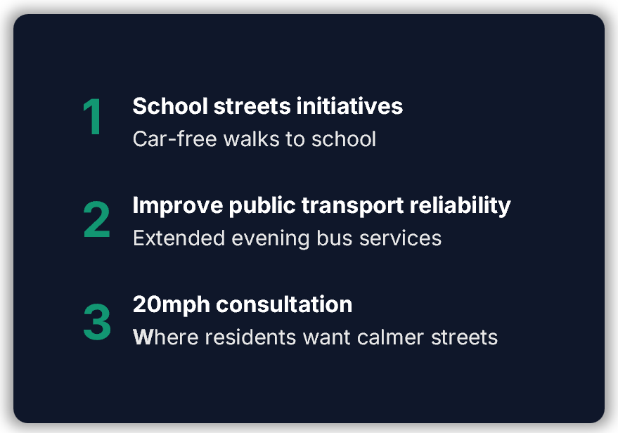 Not sure what to champion in your area? These examples are the sort of practical, resident‑focused priorities that often matter locally. Feel free to explore the evidence base behind them, or contact us to find out what community groups in your ward are already working on.